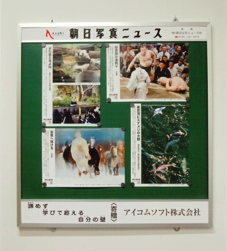これからの日本の将来を担う子供たちが少しでも多くのニュースに触れることによって、将来を考える切欠や気付きに繋がればという想いと共に、日本社会の安全性・モラルの向上を願ってスローガン(「諦めず 学びで超える 自分の壁」)付の「朝日写真ニュース社専用掲示板」を北九州市立天籟寺小学校に寄贈いたしました。
